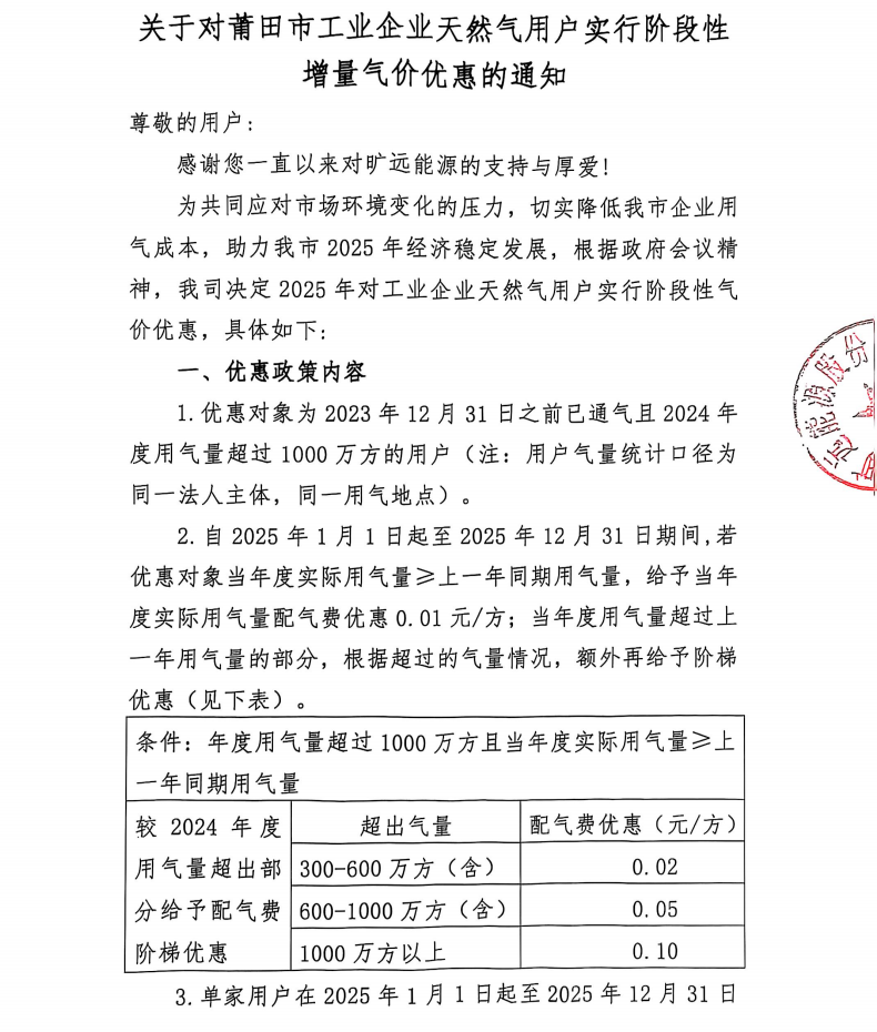 關(guān)于對莆田市工業(yè)企業(yè)天然氣用戶實行階段性增量氣價優(yōu)惠的通知