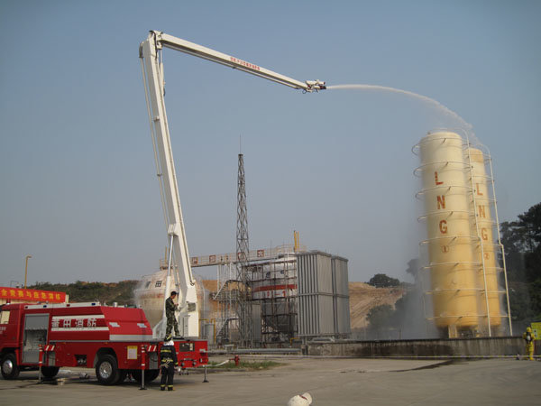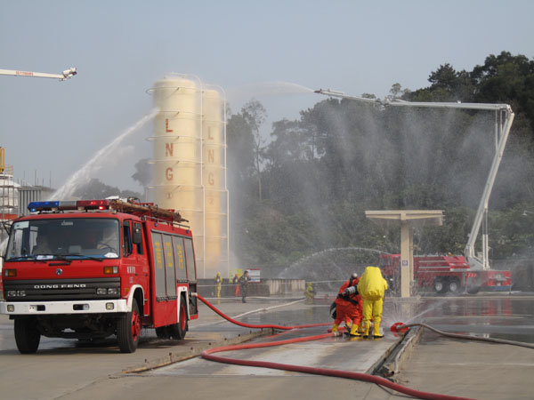 15:30分,隨著生產(chǎn)部報(bào)警聲響起,LNG灌區(qū)發(fā)生泄漏,現(xiàn)場(chǎng)指揮接警后立即按響報(bào)警器,指揮相關(guān)小組啟動(dòng)消防水泵,對(duì)灌區(qū)進(jìn)行緊急噴淋,隔離相鄰儲(chǔ)罐,并組織員工按預(yù)定區(qū)域到達(dá)避難位置。市消防派出2輛高噴消防車、6輛水罐消防車到達(dá)起火現(xiàn)場(chǎng),火情偵檢組隨即展開偵檢,先用泄露儀對(duì)現(xiàn)場(chǎng)進(jìn)行濃度檢測(cè),并用隔離帶劃出相應(yīng)的警戒線,保安配合警戒組疏散區(qū)域內(nèi)無(wú)關(guān)人員及在場(chǎng)使用中的車輛熄火,同時(shí)關(guān)閉大門,禁止除消防車、搶險(xiǎn)車外的一切車輛出入。在得知了著火位置和泄漏程度后,中隊(duì)指揮員立即下令,展開滅火行動(dòng)。消防隊(duì)員穿上消防戰(zhàn)斗服、佩戴防毒面具和呼吸器、攜帶銅質(zhì)工具和滅火器材迅速趕往事故儲(chǔ)罐,關(guān)閉儲(chǔ)罐根部所有閥門。而其余消防車按照預(yù)期指定位置,全方位對(duì)LNG灌體進(jìn)行火災(zāi)撲救。