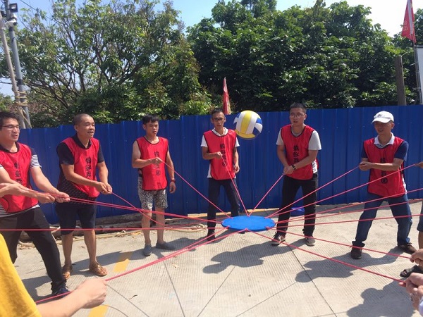 團(tuán)隊(duì)在當(dāng)天上午9點(diǎn)半左右到達(dá)目的地,經(jīng)過短暫的休息后,進(jìn)行了分組團(tuán)隊(duì)建設(shè)及熱身小活動。緊接著,作為活動的第一個項(xiàng)目“無軌列車”隆重登場了,本項(xiàng)目要求團(tuán)隊(duì)成員雙腳分別站在兩塊長約5~8米,安裝有10個提繩的長條木板上并手握提繩,行走一定的距離。由于剛開始大家沒有找到項(xiàng)目的技巧,舉步難行,兩隊(duì)都是東倒西歪,經(jīng)過磨合溝通后,最終順利地完成了比賽。該項(xiàng)目提升了團(tuán)隊(duì)激情及凝聚力。